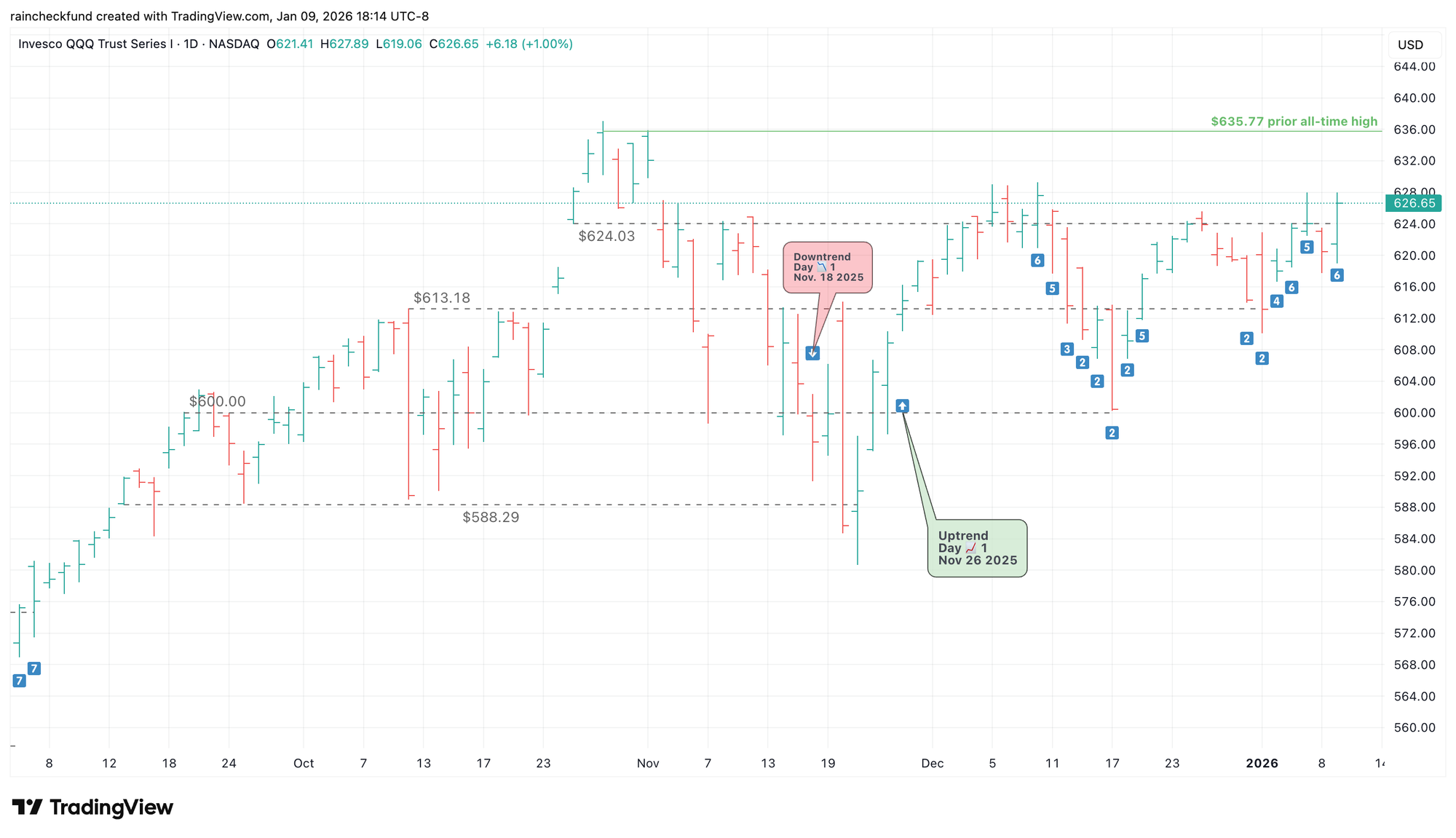 QQQ has tested the $624.03 level 3 times in the past month, subsequently finding support and putting in a higher low each time - a bullish indication.