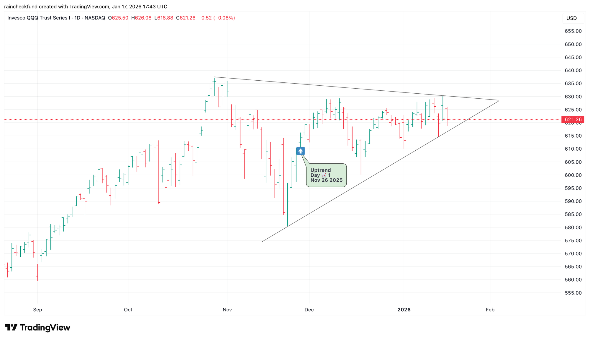 Volatility is compressing toward two converging trendlines. Higher lows suggest persistent dip buying, with price approaching considerable resistance at the prior all-time high of $635.77. Resolution of this pattern could set the stage for the next major price move, with a breakout likely accompanied by a surge in volume.